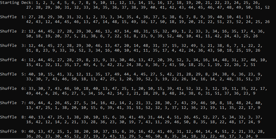 Console.WriteLine("Shuffle " + (x + 1) + ": " + WriteDeck(newDeck));