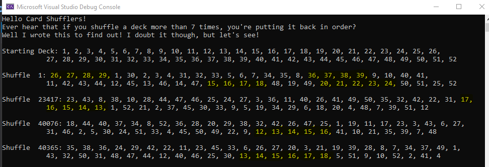 Here you can see several trends after the first shuffle, but then not a one until over 23,000 shuffles go by. Then not again until the 40,000's where we have 3 shuffles quite close together with trends. I highlighted the trends in yellow for easier finding.