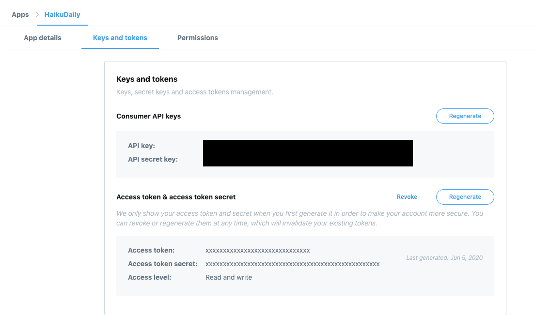 Twitter does ask a lot of questions and as long as you fill in reasonable answers, you will get through. Once you have filled the form, create an app, and head over to the Keys and tokens section. From there grab your API Key, Secret, Access token, and secret