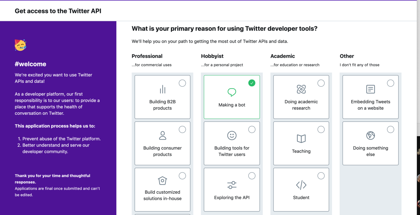Head to https://developer.twitter.com/en so that you can create an account and get access to Twitter APIs.