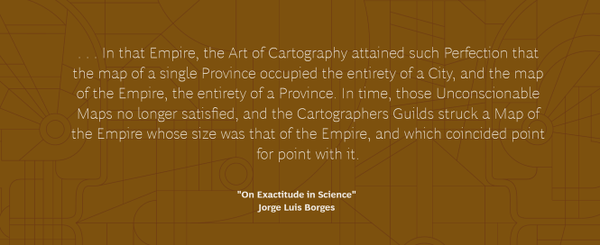 "In that Empire, the Art of Cartography attained such Perfection that the map of a single Province occupied the entirety of a City, and the map of the Empire, the entirety of a Province. In time, those Unconscionable Maps no longer satisfied, and the Cartographers Guilds struck a Map of the Empire whose size was that of the Empire, and which coincided point for point with it. The following Generations, who were not so fond of the Study of Cartography as their Forebears had been, saw that that vast map was Useless, and not without some Pitilessness was it, that they delivered it up to the Inclemencies of Sun and Winters. In the Deserts of the West, still today, there are Tattered Ruins of that Map, inhabited by Animals and Beggars; in all the Land there is no other Relic of the Disciplines of Geography"