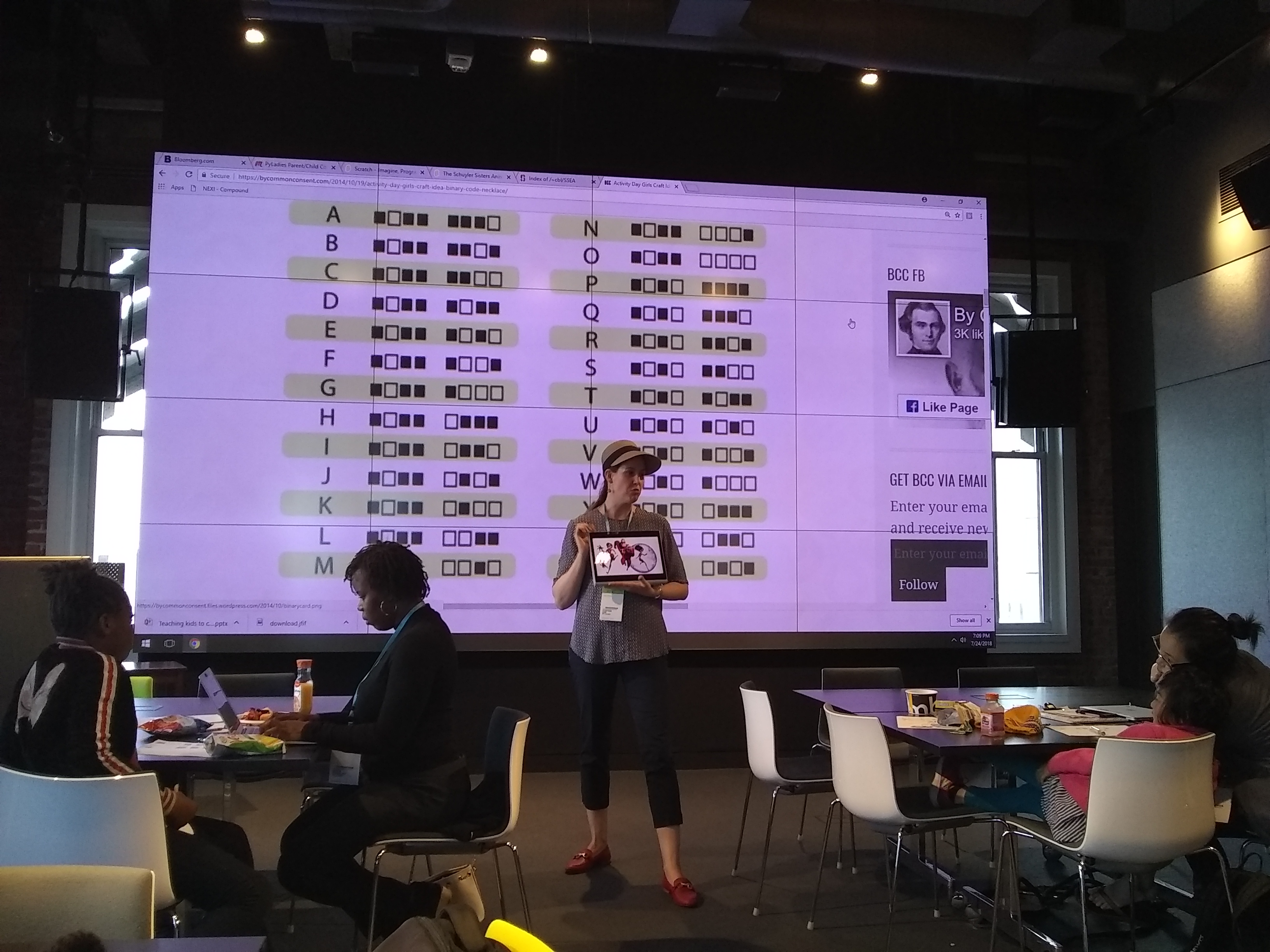 [Computer Science Lecturer Cynthia B. Lee standing in front of a binary letter decoder. She uses binary to create jewelry that spells out your name, how cool is that?! ]