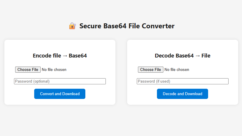 When you set a password, the data is encrypted using the AES-256-CBC algorithm before being encoded in Base64. The decoding process works exactly the opposite: you upload the Base64 text file and enter the password if you used one during conversion . The script decodes your data back into a file, and it automatically downloads in its original form.