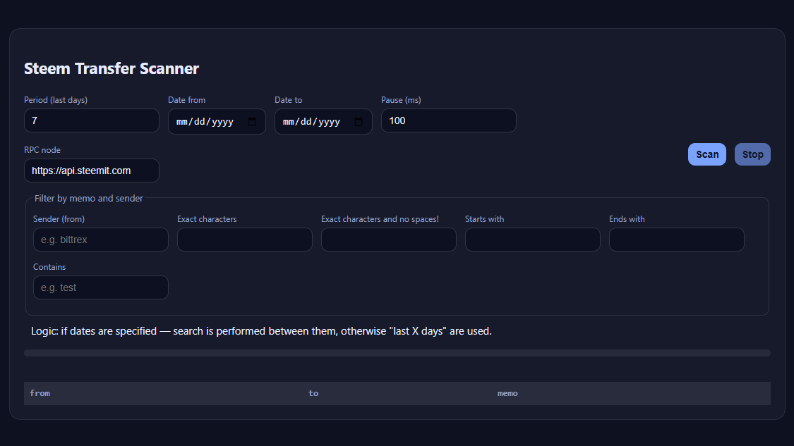 Below the filters there’s an explanation that if no dates are specified, the “last X days” option is used. Below that there’s a progress bar showing how many blocks have already been scanned, and a table where the found transfers appear. The table is simple: three columns - “from,” “to,” and “memo.”