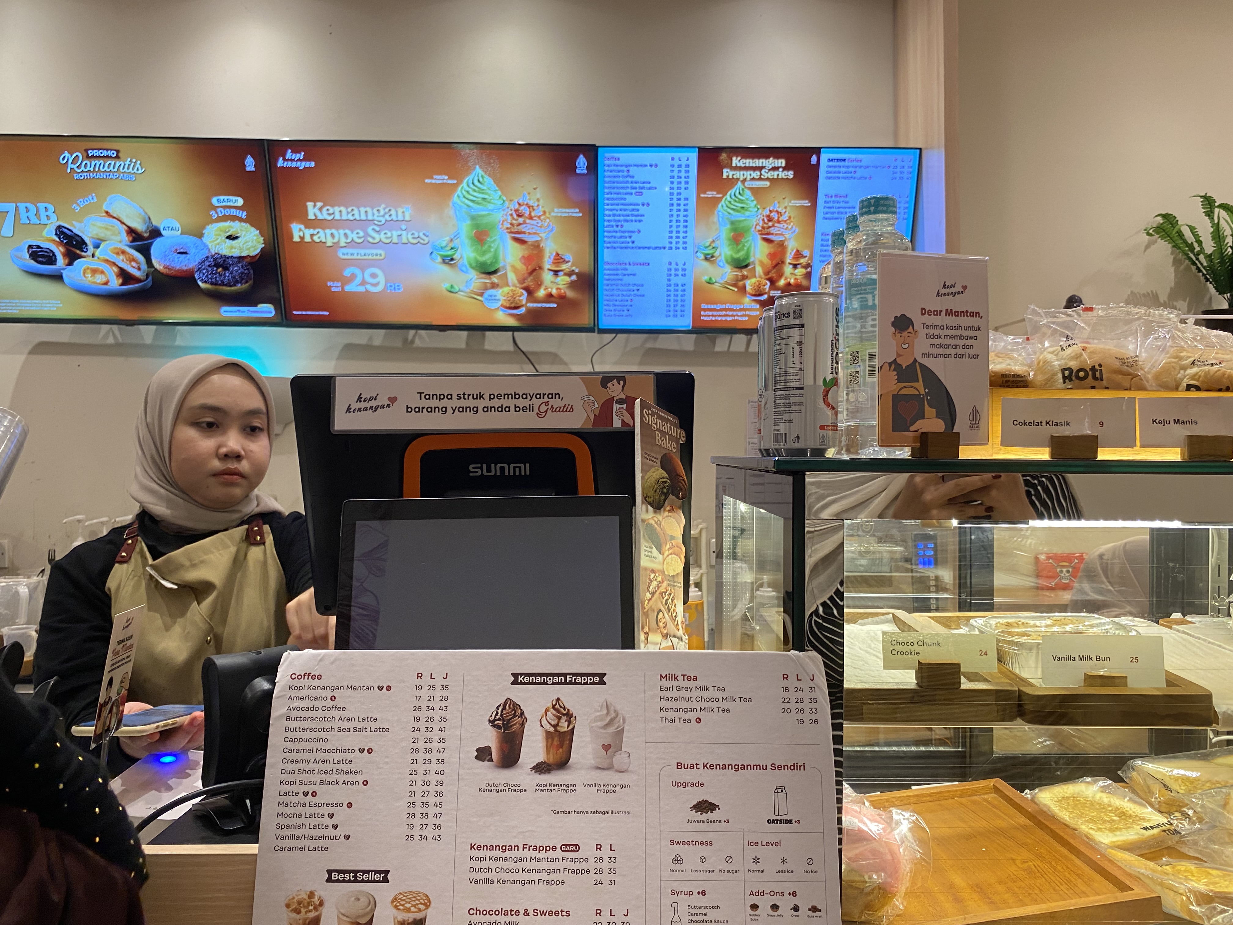Waktu saya datang ke Kopi Kenangan, suasananya cukup nyaman walau tempatnya ga terlalu besar. Lantai satunya lumayan sempit, apalagi kalau lagi rame, soalnya meja-mejanya lumayan rapat. Tapi untungnya ada lantai dua, dan di atas suasananya lebih lega dan lebih tenang, enak buat duduk lebih lama.