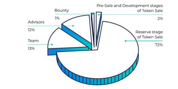 Alokasi Token: Penjualan: 72% Tim: 13% Penasihat: 12% Pra-Penjualan dan Tahapan Pengembangan: 2% Bounty: 1%