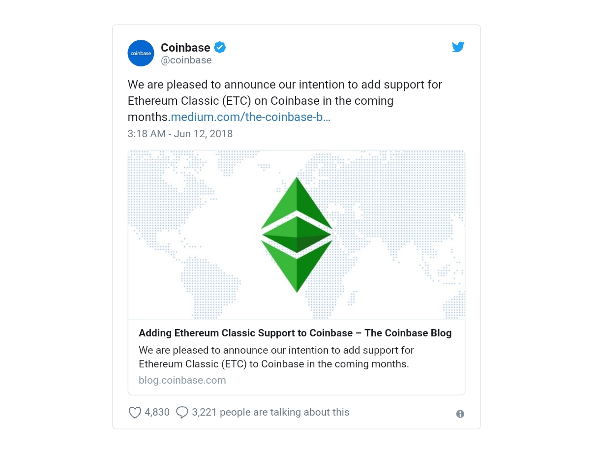 L'intégration d'Ethereum Classic dans la liste des jetons pris en charge par Coinbase ne se fera pas immédiatement - Coinbase indique que les clients commenceront à voir les API publiques et d'autres signes que l'actif est ajouté à la plate-forme pendant que le travail d'ingénierie se développe: