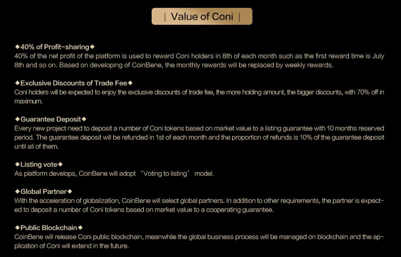트레이드 마이닝(1번)이 종료되면 거래소가 거둔 수익 상황에 따라 새로운 복지 프로그램이 발표됩니다.7월 8일부터 거래소 수익의 40%를 매달 8일마다 Coni 홀더에게 지급합니다.