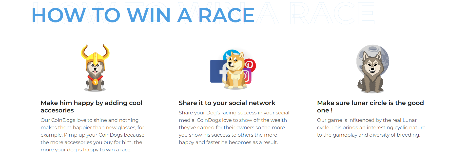 Share your Dog’s racing success in your social media. CoinDogs love to show off the wealth they've earned for their owners so the more you show his success to others the more happy and faster he becomes as a result.