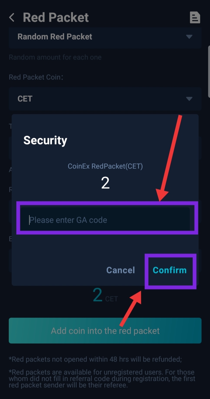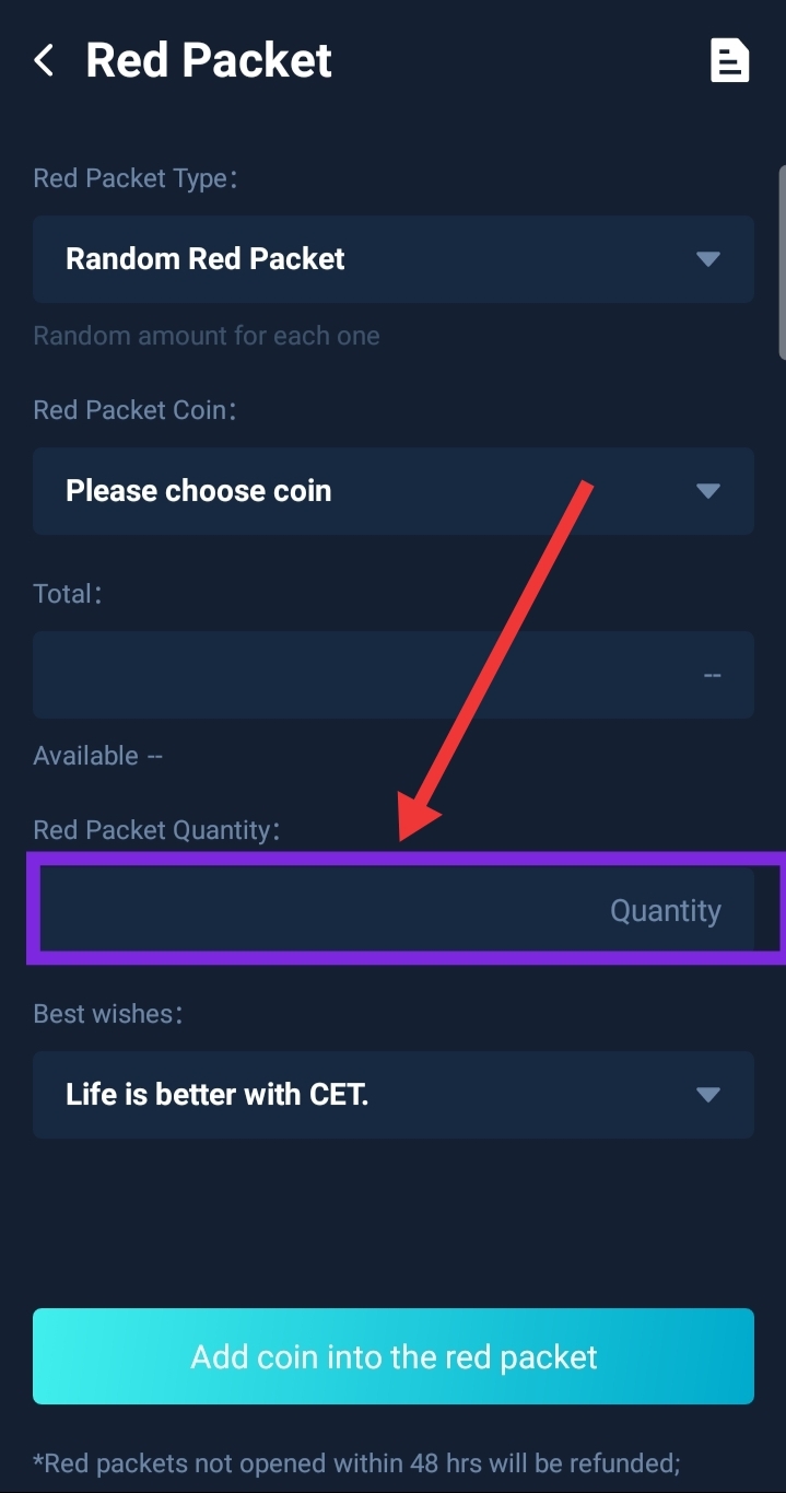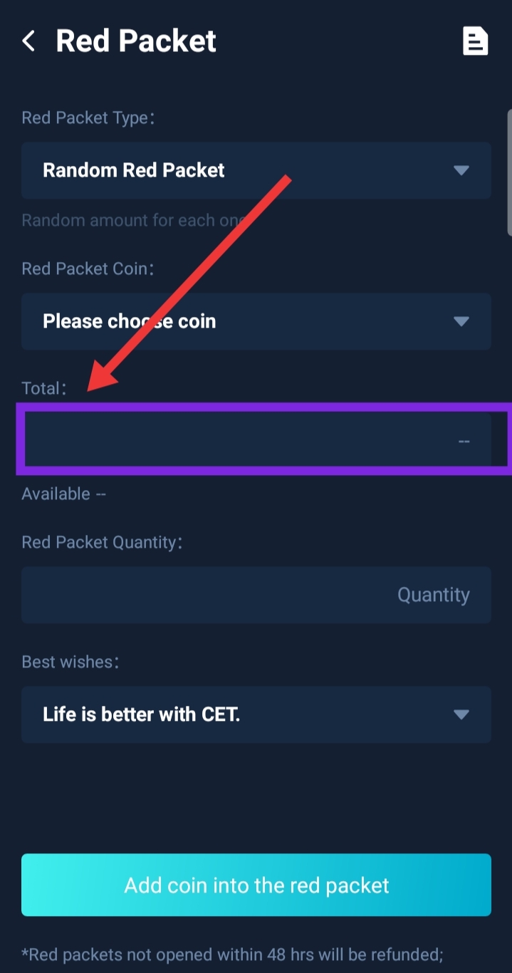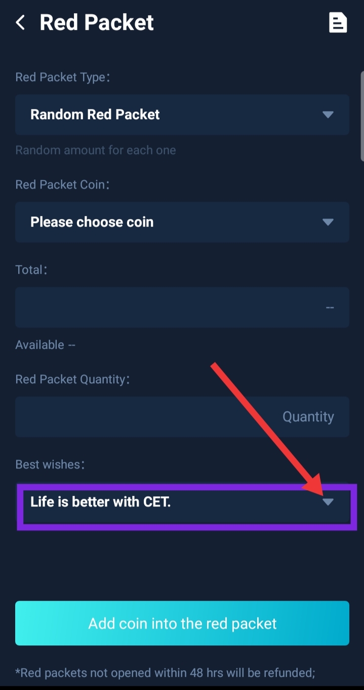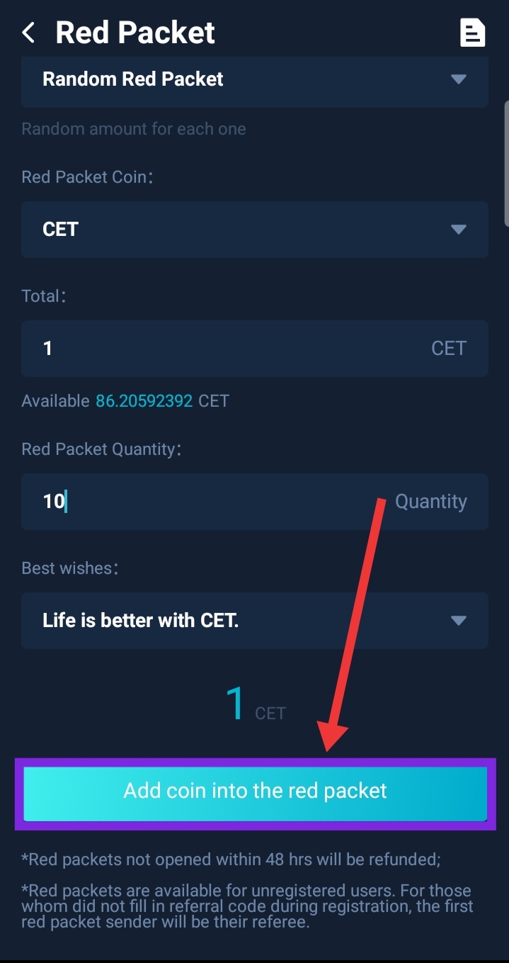 - Click on "Add coin into the red packet"