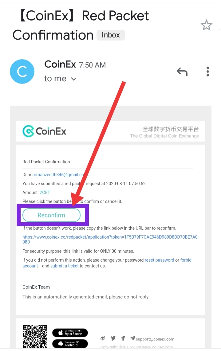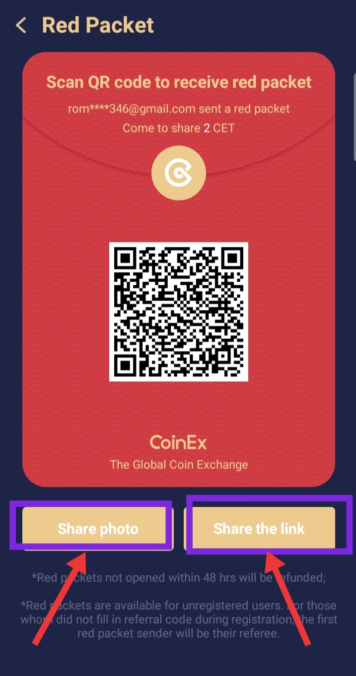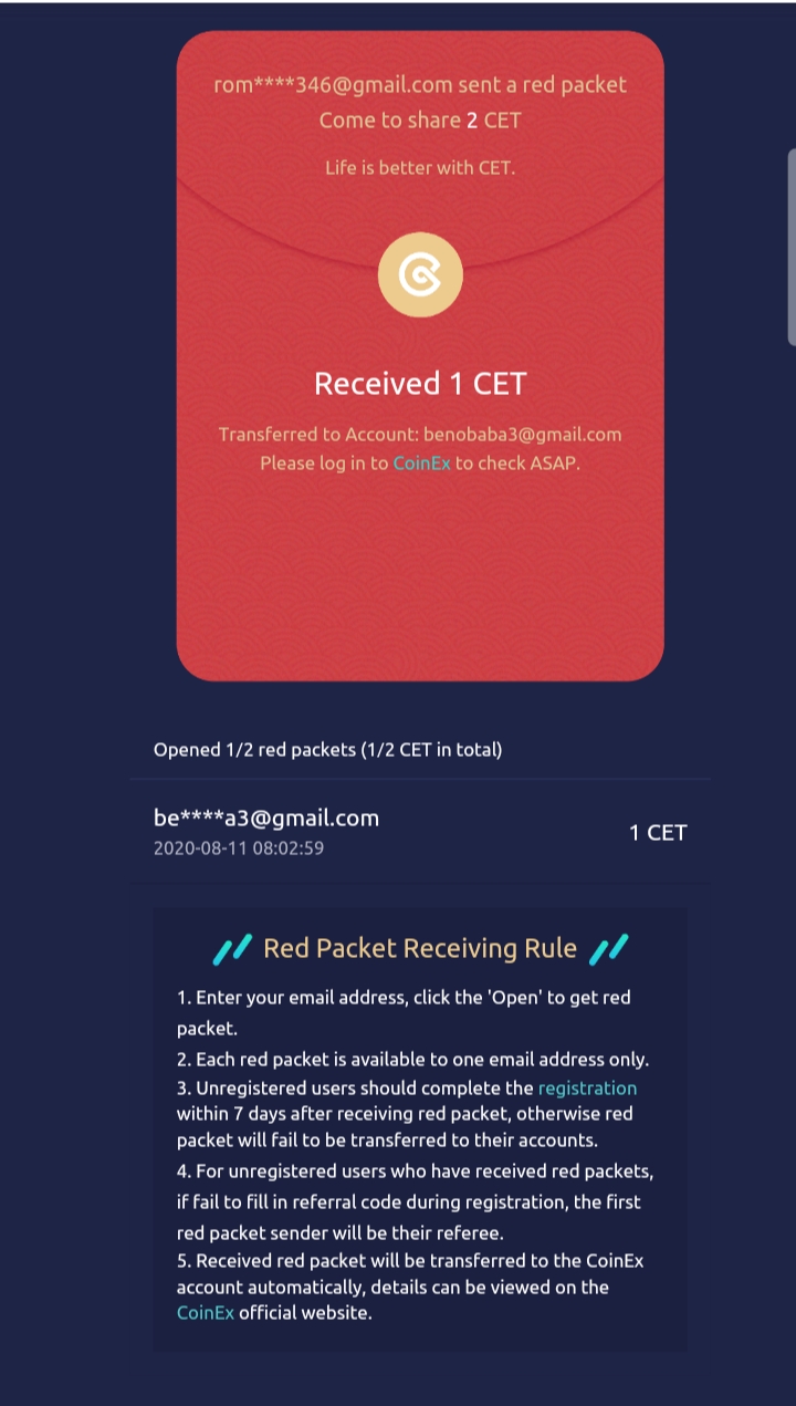 If you already have an account with that same email on CoinEx, the Red Packet you claimed will be automatically credited into your CoinEx account, but if you don't have an account yet, you are to register with that same email on CoinEx and your claimed Red Packet will be credited into your account.