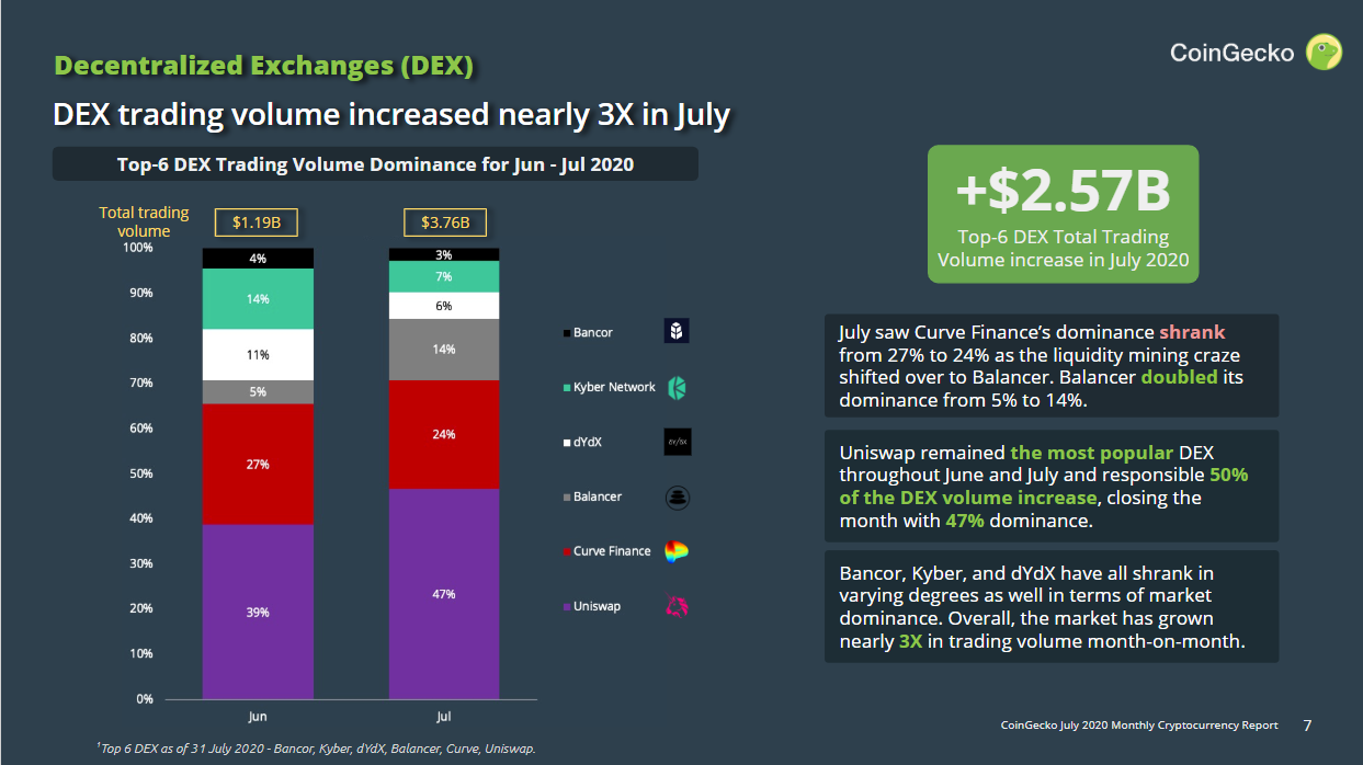 Bancor, Kyber Network, and dYdX have been losing DEX market share in July.