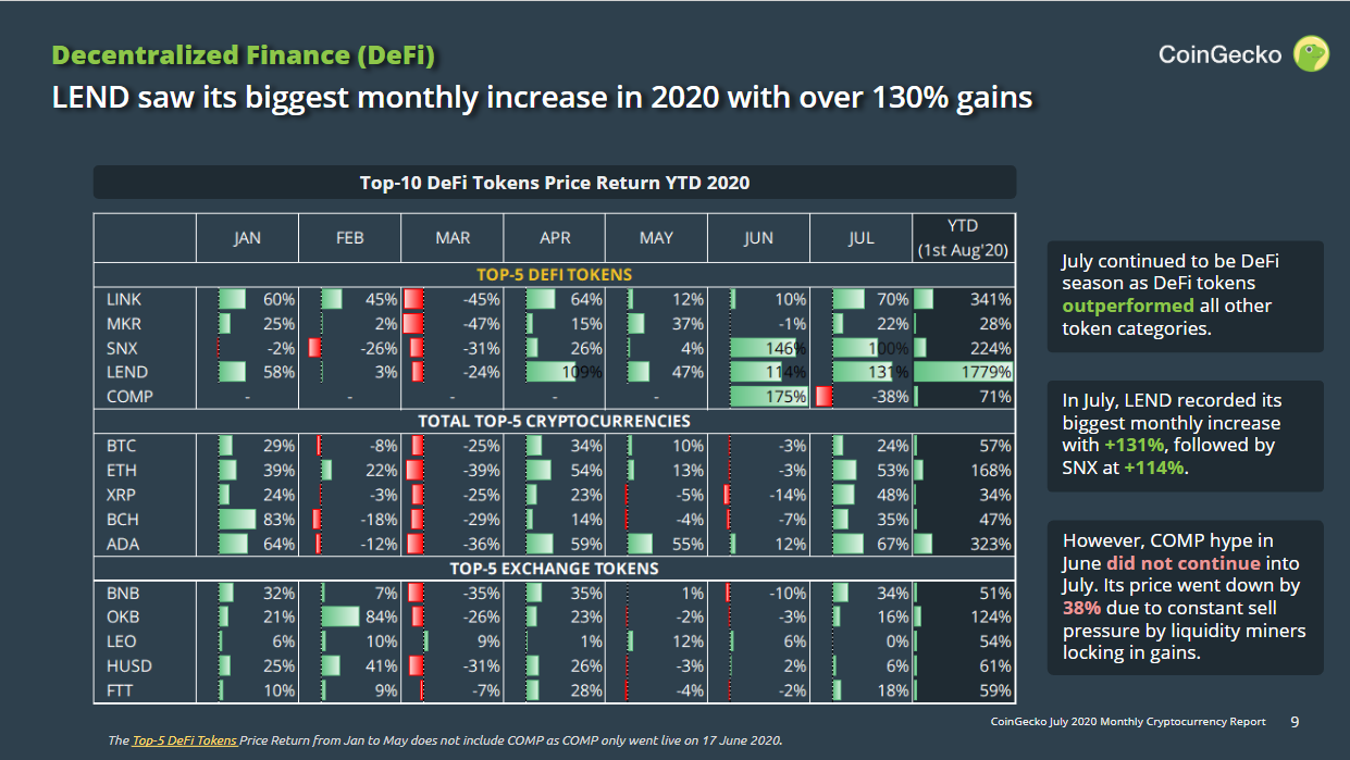4. DeFi tokens rallied in July with LEND registering its highest monthly price return in 2020