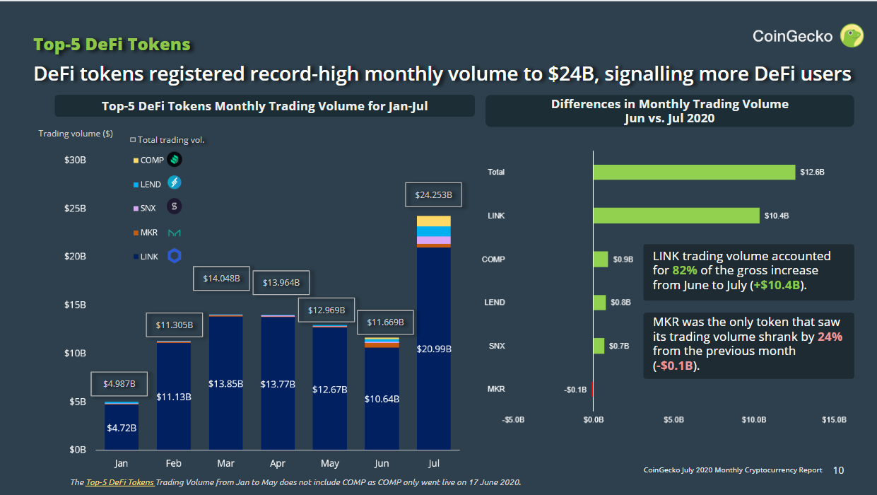 5. The Top-5 DeFi tokens saw trading volume hit a high of $24 billion in July, more than double the previous month. ChainLink (LINK) contributed 82% of the increase.