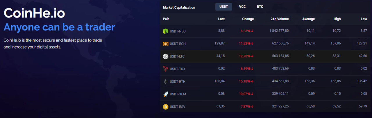 - быстрая торговля. CoinHe.io поддерживает быстрое и точное выполнение транзакций. То есть пользователь может осуществлять до 5000 транзакций в секунду;
