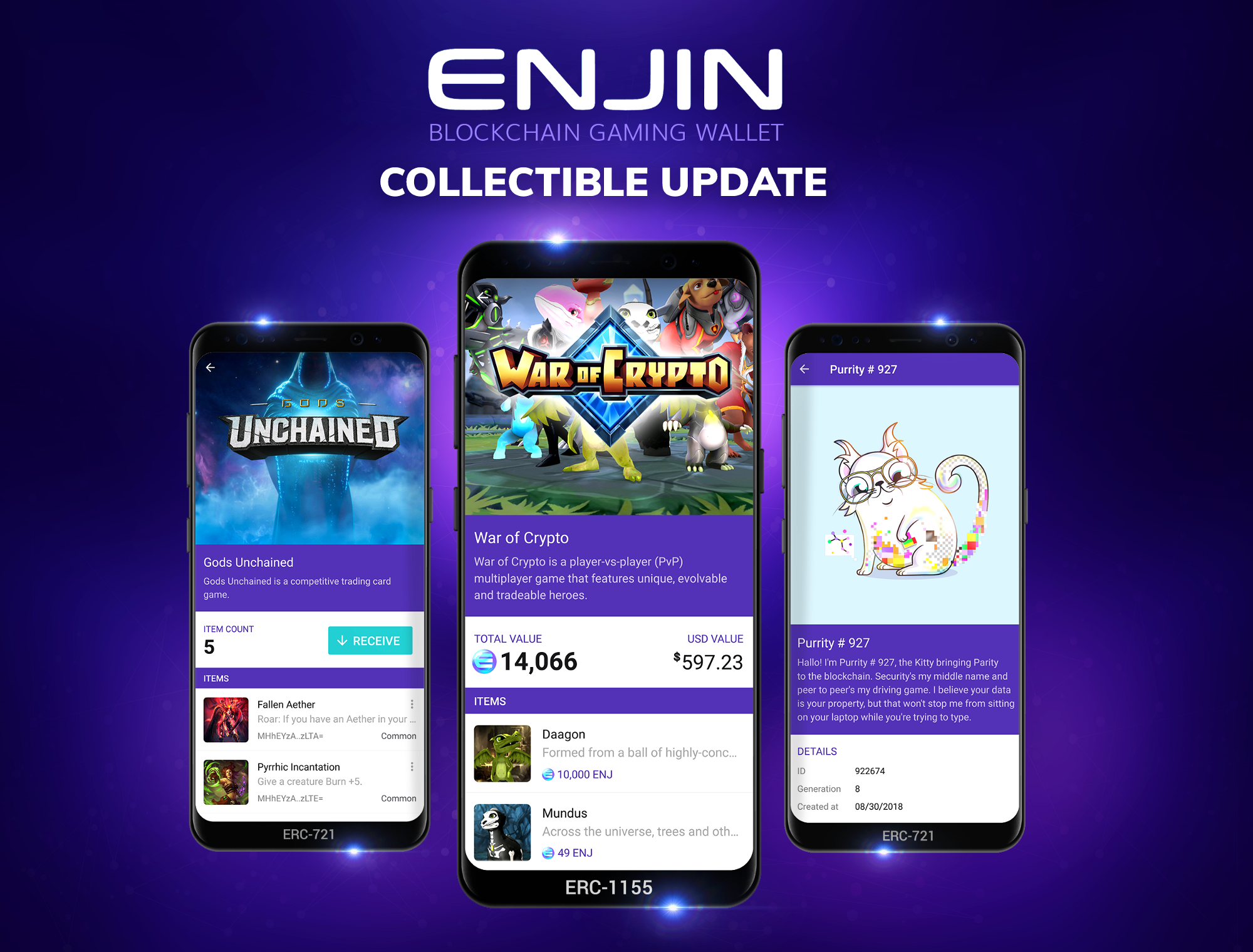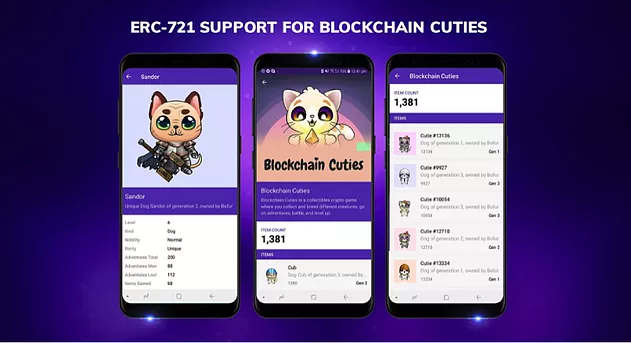 엔진 지갑으로 지원하는 Gods Unchained와 CryptoKities의 자산에 더하여 Enjin 지갑은 유명한 수집 게임인 Blockchain cuties와 Axie Infinity의 컬렉티블을 지원하기 시작했습니다. 중요한 업데이트를 강조하고 엔진의 부분이 된 것을 표시하도록 Blockchain cuties은 Enjin 테마 귀염둥이를 만들었습니다.