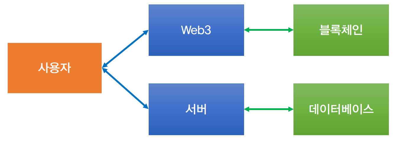 EOS DApp도 역시 이더리움과 마찬가지로 하이브리드방식의 App입니다. DApp의 코드를 호스팅하는 서버가 존재하며 사용자와 데이터베이스간 통신의 중재자 역할을 합니다.