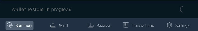상단의 메뉴 위에 지갑이 복원중이라는 것을 보여준다. 복원 시간은 몇 시간 걸린다. 지갑의 생성 시기에 따라서 다르겠지만 블럭체인을 찾을 때까지 다 검색해야하니까 오래걸린다.