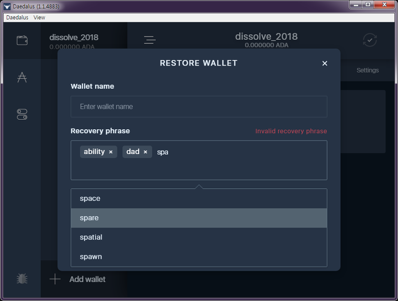 다 입력을 하고 버튼을 누르면 이전 버전에서는 아무 것도 할 수 없었지만 이번 버전 부터는 다른 동작을 할 수 있게되었다. 복원창을 닫고 복원 이외의 작업을 할 수 있다. 복원 중에 새로운 지갑을 생성할 수 있다. 다른 지갑이 있으면 에이다 전송도 가능한지는 안해봤는데 가능 할 듯하다.