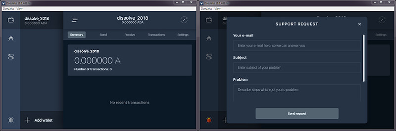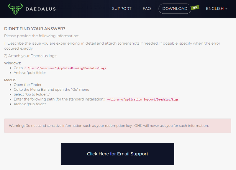 기존에는 홈페이지에서만 할 수 있었다. 기존에 홈페이지서 사용해봤었는데 다이달로스 팀의 답메일은 하루가 안걸리게 왔었다. 다이달로스홈페이지의 서포트메뉴에 아래쪽에 있다. 이것이 다이달로스 지갑안에서도 가능하게 되었다.
