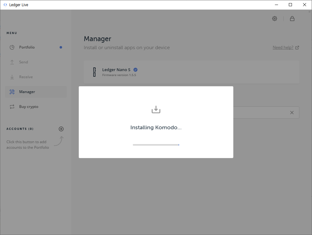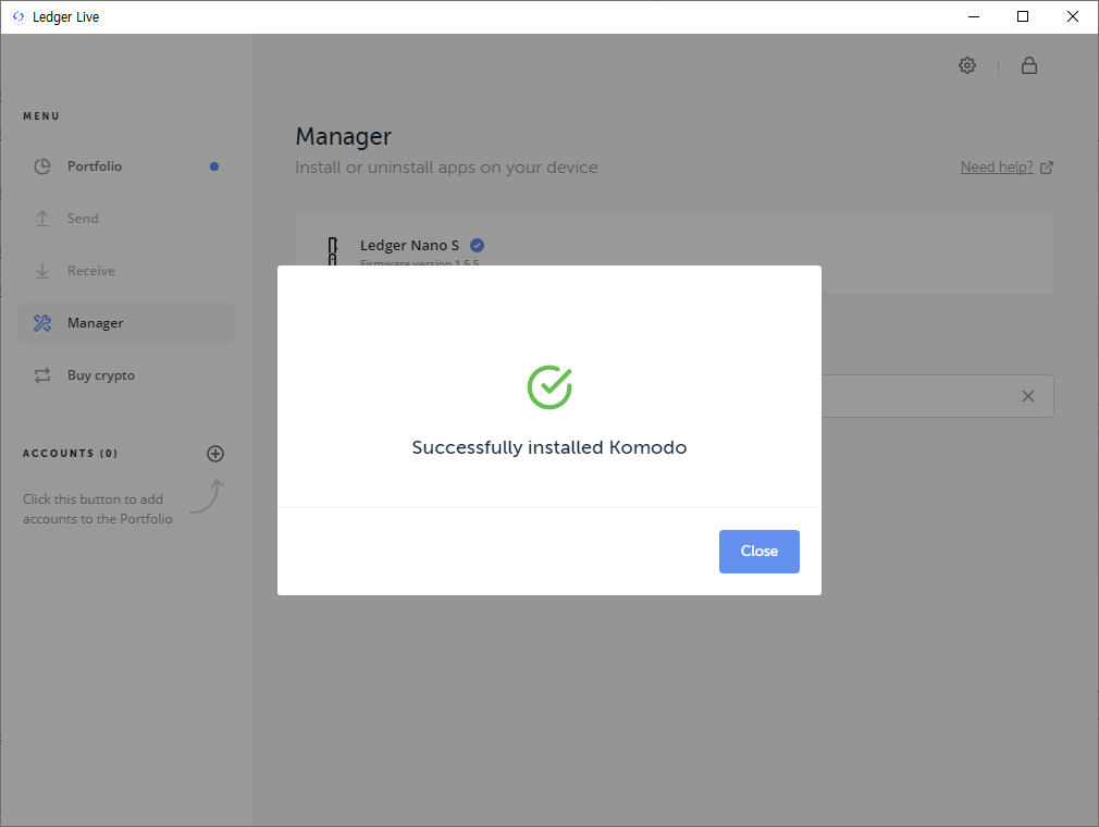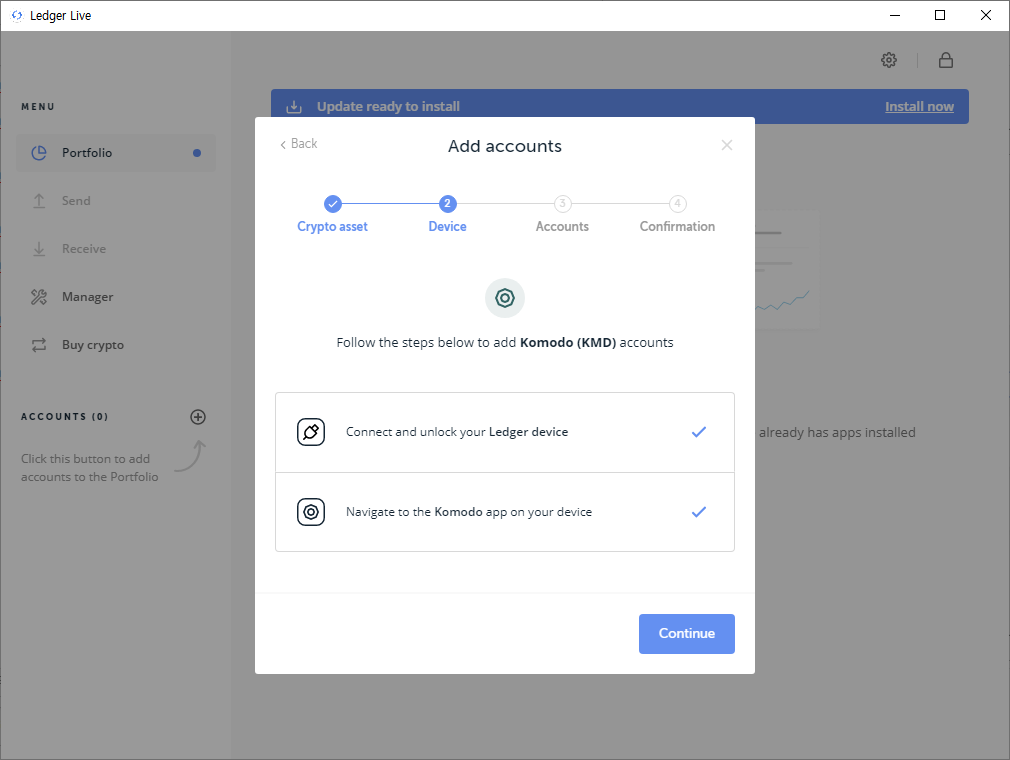 렛져지갑에서 위에서 설치된 코모도를 실행하라고 메세지가 뜨면,