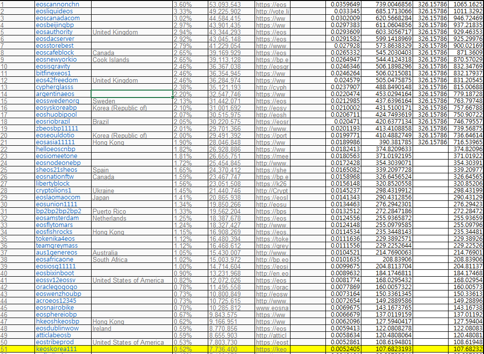 eoscafeblock이 얻은 투표 수 / 전체 BP가 받은 투표수의 합 의 비율로 나누어 주게 됩니다. 이를 얼마전 기준의 표로 계산하면 다음과 같습니다.