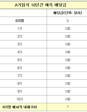 어떤 A라는 가상의 기업을 예로 들려고 한다. 이 기업은 향후 10년동안 매년 100달러씩 배당할 것으로 예상된다.