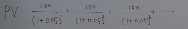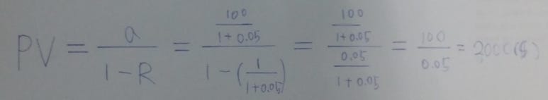 초항은 (100)/(1+0.05)^1 이 될 것이고 공비는 1/(1+0.05)이 된다. 이런 무한등비수열의 합 공식은 a/(1-R) 이다. 여기서 a는 초항이고 R은 공비이다.