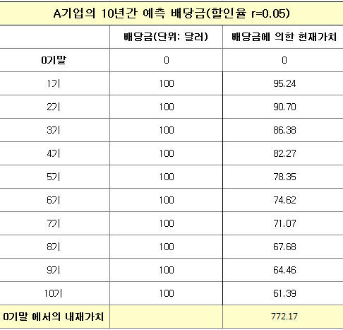 이제 이 할인율 개념을 도입하여 가상의 A기업 배당에 의한 가치를 계산해보자.