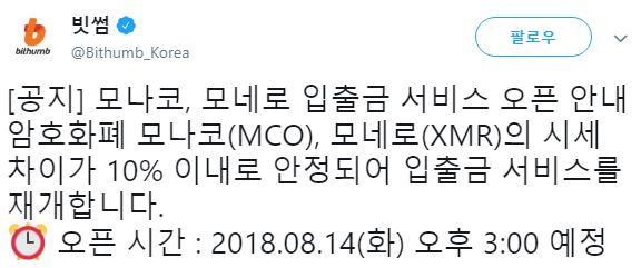 국내 암호화폐 거래소 빗썸이 모네로(XMR, 시총 10위), 모나코(MCO, 시총 74위)의 입출금 서비스를 재개했다고 공지했다.