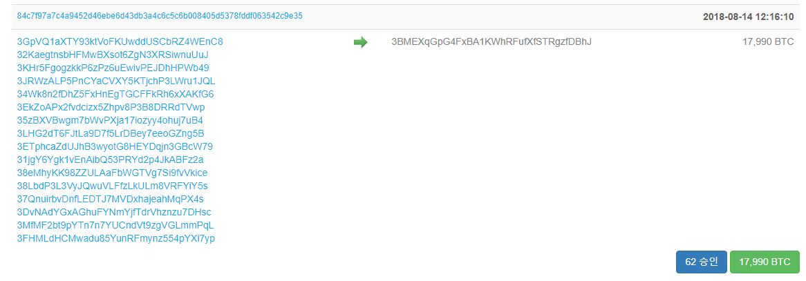 오늘 새벽 3시 30분 '3BMEXqGpG4FxBA1KWhRFufXfSTRgzfDBhJ'에 총 17,990 BTC가 6개의 주소로부터 이체됐다. 해당 지갑은 현재 18,000.64 BTC(약 1.13억 달러)를 보유하고 있는 것으로 나타났다. 이주소는 마진 거래소 BITMEX 계정 주소이며 이 대량의 비트코인들이 어떤 포지션에 쓰일지가 주목됩니다.