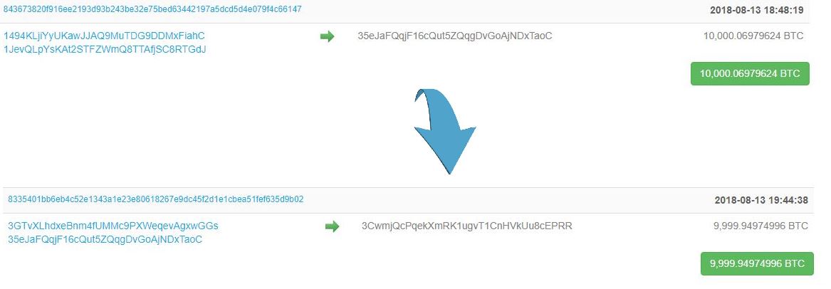 13일 18시 48분 경 BTC 주소 '1494KLjiYyUKawJJAQ9MuTDG9DDMxFiahC'와 '1JevQLpYsKAt2STFZWmQ8TTAfjSC8RTGdJ'에서 각각 5000 BTC씩 동시에 '35eJaFQqjF16cQut5ZQqgDvGoAjNDxTaoC'주소로 이체됐다. 10,000 BTC가 입금된 해당 주소는 이후 13일 19시 44분 '3CwmjQcPqekXmRK1ugvT1CnHVkUu8cEPRR' 주소로 다시 10,000 BTC를 이체한 것으로 나타났다.