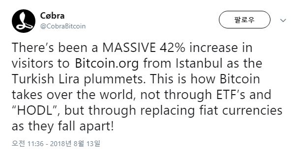 Bitcoin.org의 설립자 겸 운영자 코브라(Cobra)가 트위터를 통해 "터키 리라화의 폭락 이후, Bitcoin.org의 이스탄불 소재 접속자 수가 42% 증가했다"고 밝혔다. 이와 관련해 그는 "이는 세계가 앞으로 어떤 과정을 통해 BTC를 받아들이게 될지를 보여주고 있다"며 "BTC는 ETF나 HODL이 아니더라도, 기존 법정화폐가 무너지게 되면서 결국 법정화폐를 대체하게 될 것"이라고 내다봤다.
