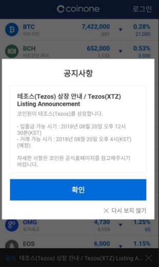 국내 암호화폐 거래소 코인원이 20일 16:00 테조스(Tezos, 시총 18위)를 원화마켓에 상장한다고 공지했다.