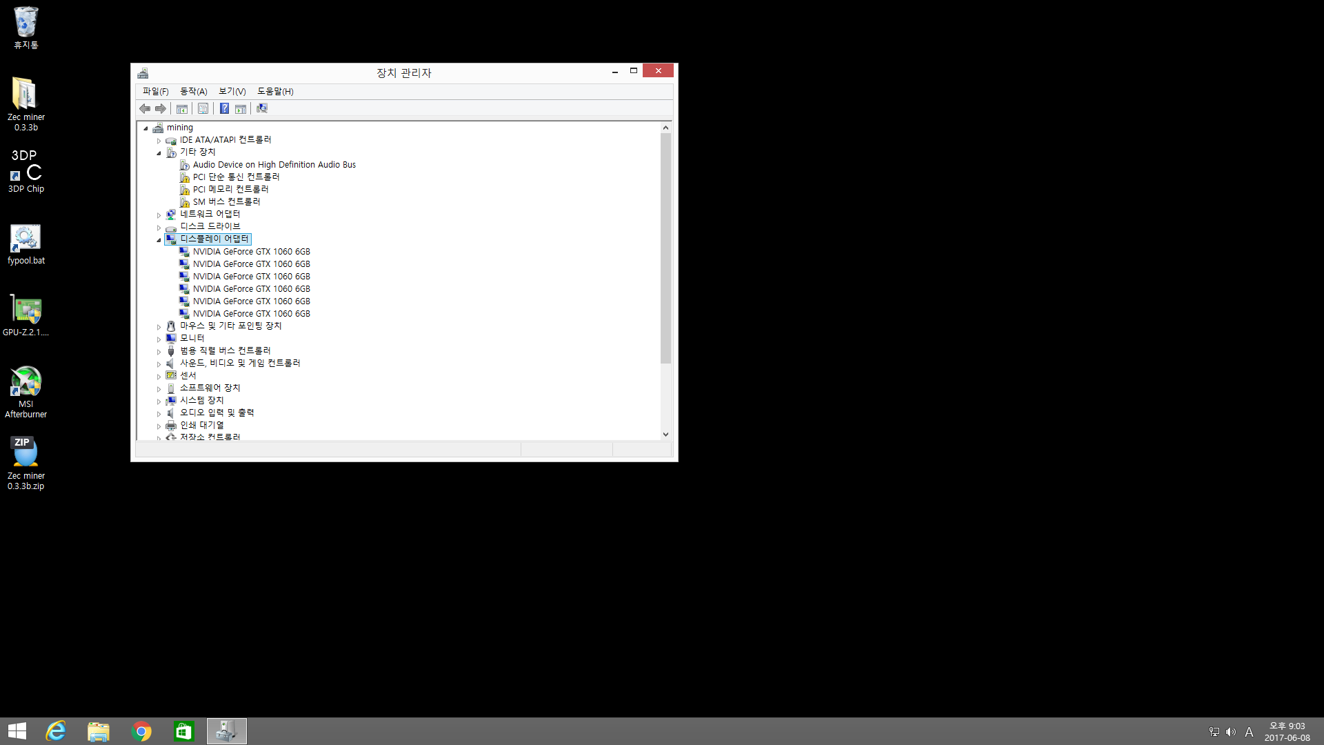 6개 모두 인식하지 않을 경우 그래픽카드 하나씩 제거해가며 인식하지 않는 포트 확인. 라이져카드 교체해가며 원인을 찾아야합니다. 부팅 후 깜빡깜빡 거리며 그래픽카드를 하나씩 차례로 인식하게 됩니다. - 추천유틸 설치
