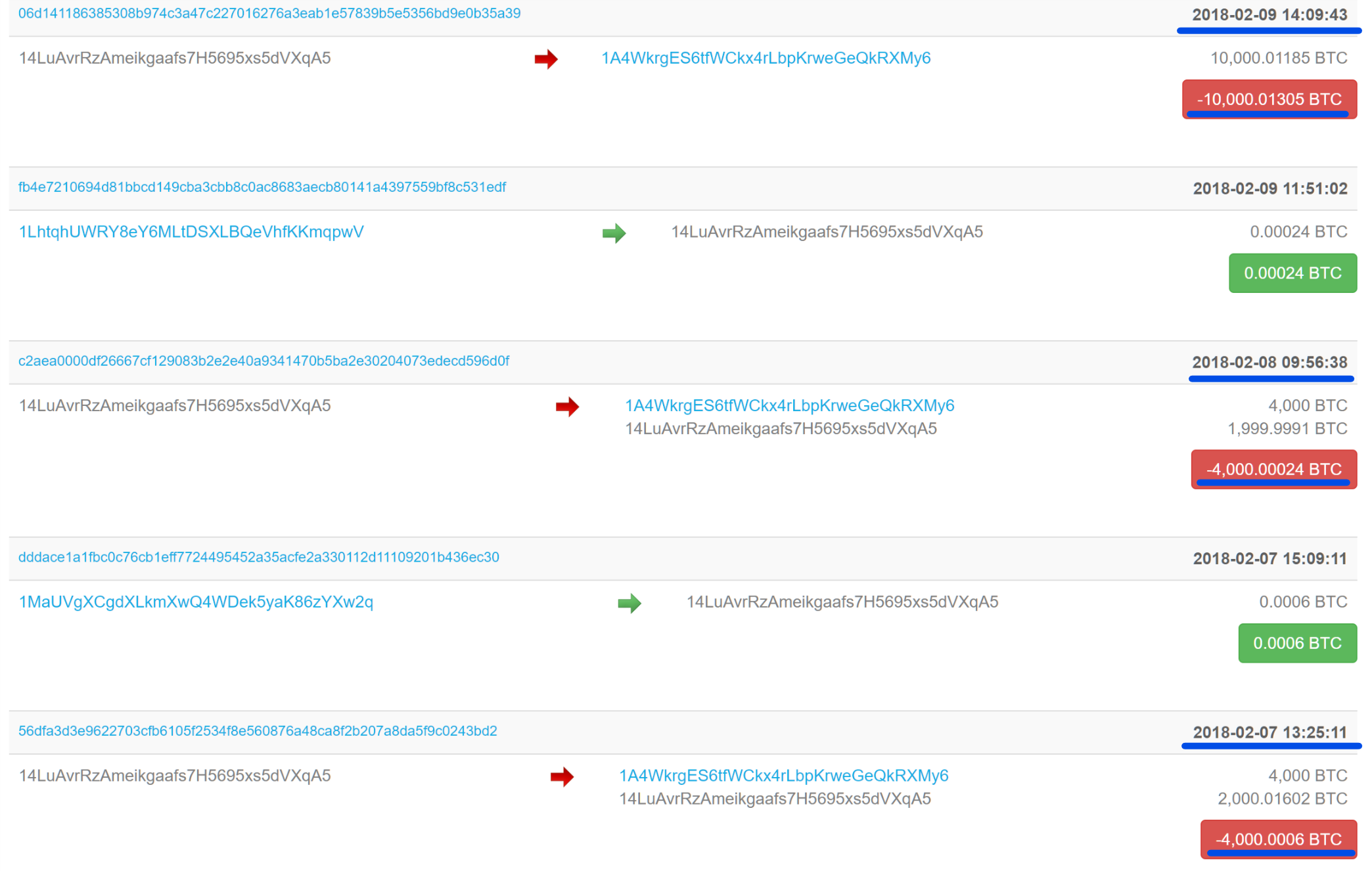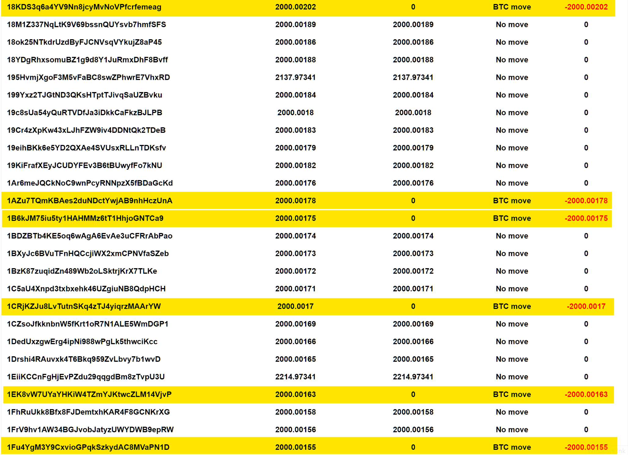 위에 두 사진에서 8곳의 지갑에서 2,000 BTC 씩 총 16,000 BTC가 이동된 것을 확인할 수 있습니다.