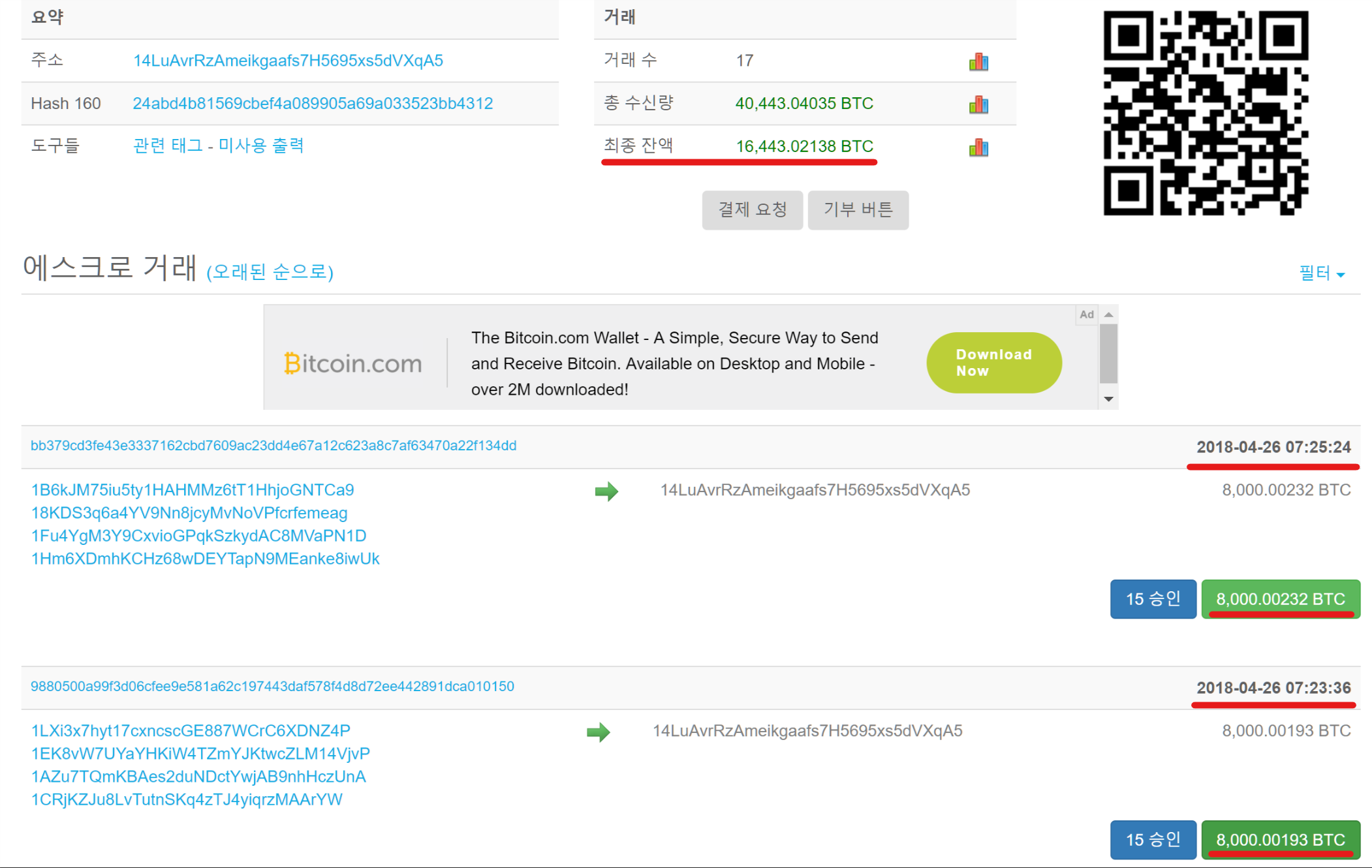 현재 16000 BCH 보유 지갑