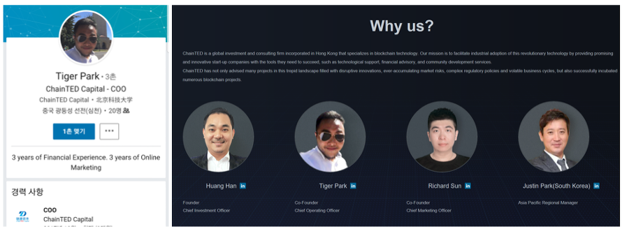 ChainTED는 홍콩에 설립 된 글로벌 투자 및 컨설팅 회사로 아우름엑스와 협업했다고 합니다. 파트너쉽 뿐만아니라 체인테드 COO인 타이거박과 아시아태평양 매니저와 체인테드 한국대표 저스틴 박이 어드바이저로 참여한다고 하네요. 많은 분들이 아이씨오를 볼 때 가장 중요하게 생각하시는 부분이 바로 개발진과 인맥 그리고 어드바이저입니다.
