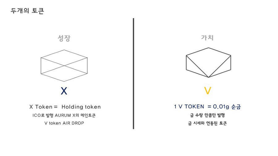 채굴과 금을 아우른다는 뜻에서 보이 듯 채굴을 의미하는 X 그리고 금 시세에 연동되어 움직이는 V 이렇게 두가지 토큰을 발행합니다. 400평 규모의 대형 채굴장을 여러군데 갖고있기 때문에 암호화폐 채굴을 통해 나온 수익을 모두 금을 구매하고 금 시세에 변동이 있으면 X토큰을 보유하고 있는 사람들에게 에어드랍 형식으로 V코인을 분배하게 됩니다.