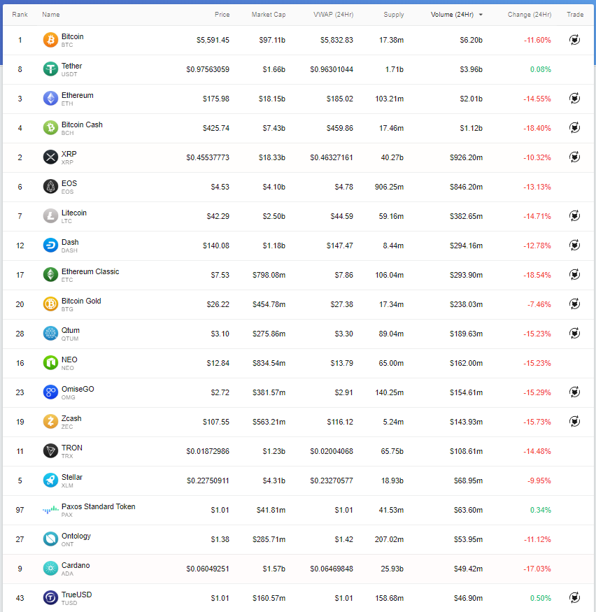 Today was a bloodbath, red all over the boards. Someone was selling Bitcoin and that moves the whole market-- but similarly, when Bitcoin rises so do many other coins so its a +/-.