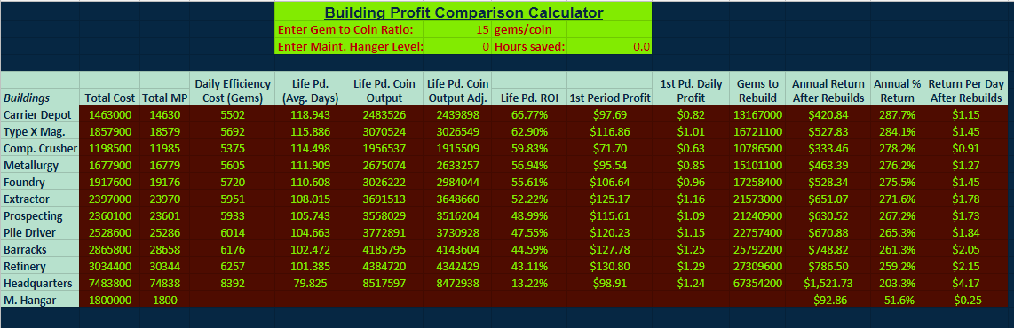 Compares maxed out buildings total return (profit) and percent return.
