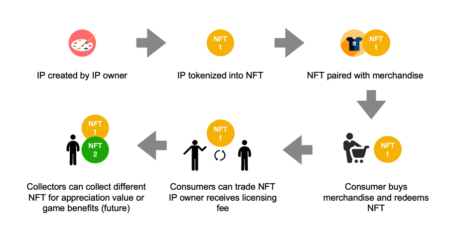 The merchandise produced by merchandisers will be the only one obtained through IP licensing with NFT holders. Each NFT captured can be used several times, limited to provide merchandise. The NFT that is collected also has certain limitations to create further NFT for IP owner protection.