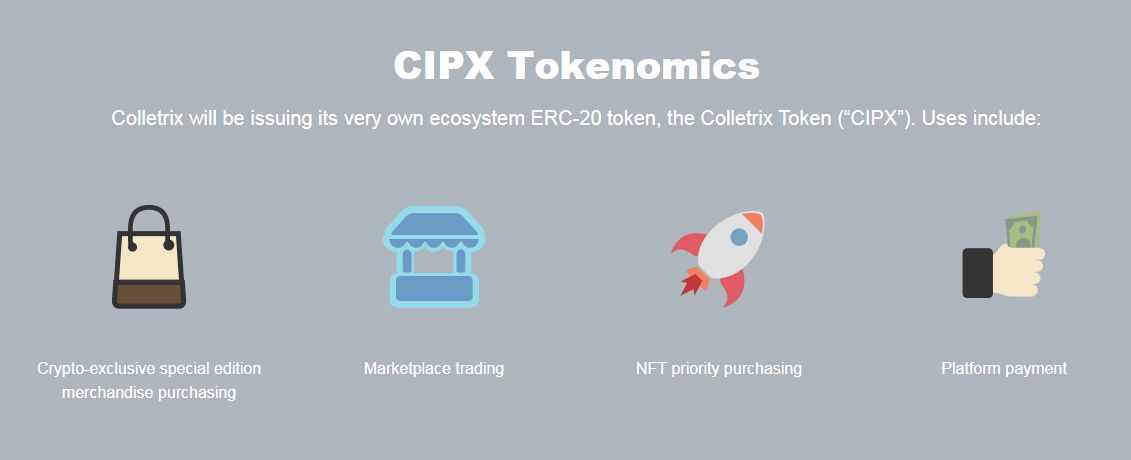 Colletrix Tokens (CIPX) will produce creation from very different ecosystems and benefit more users. Part of the project will also involve the development of the NFT to represent the ownership of unique IPs related to the merchandise. Another part of the project will provide the latest creation for development involving CIPX. That will be a cryptocurrency circulating in the Colletrix ecosystem.