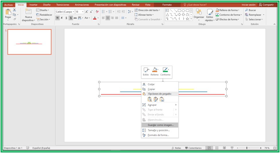 Al tener todos los elementos agrupado, sólo debemos presionar clip secundario y presionar la opción que dice guardar como imagen, ya con eso tendremos nuestra imagen del separador disponible, y no se preocupen que sólo quedan guardado los elementos sin que se vea el fondo de la diapositiva o cualquier otro elemento.![]() Capture de pantalla de mi computadora en la aplicación de PowerPoint |