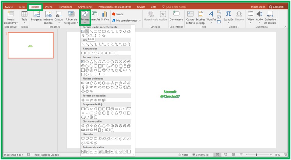Una vez insertada el mensaje personalizado, procedemos a agregar unas líneas, en la parte superior de PowerPoint volvemos a presionar insertar, pero esta vez le damos donde dice formas, y buscamos la que dice Líneas, de allí realizamos la forma de las líneas a nuestro gusto, aquí les muestro un ejemplo particular en las siguientes imágenes.![]() Capture de pantalla de mi computadora en la aplicación de PowerPoint |