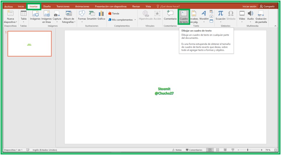 Ingresamos en nuestra computadora a la aplicación de PowerPoint, en una diapositiva en blanca vamos a insertar un cuadro de texto, el cual lo conseguimos en el menú de la parte superior, presionamos donde dice insertar y luego buscamos cuadro de texto, lo dibujamos en medio de la diapositiva y escribimos la palabra personalizada de nuestro separador, como se muestra en la siguiente imagen.![]() Capture de pantalla de mi computadora en la aplicación de PowerPoint |