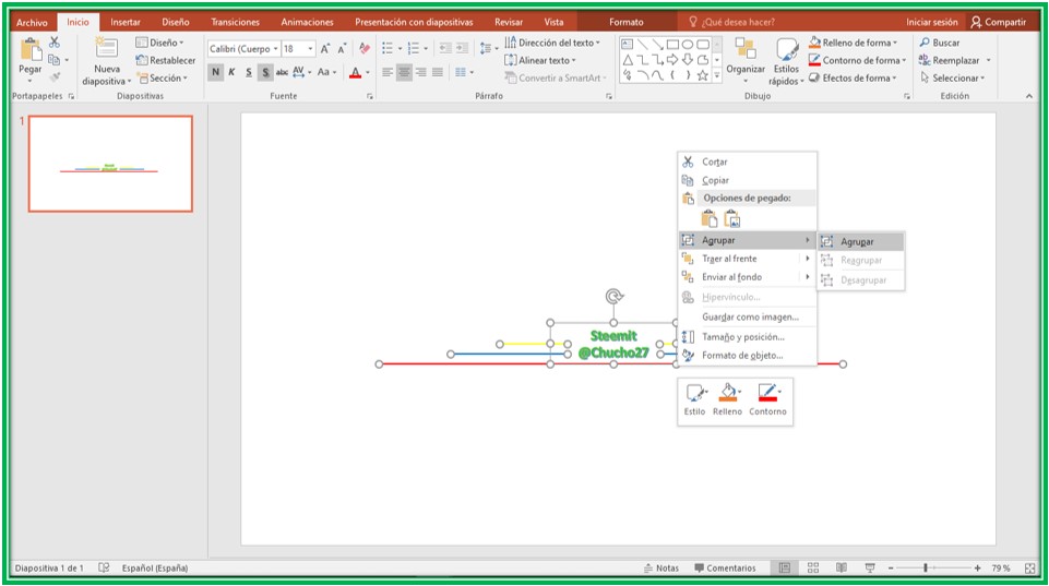 Una vez que tenemos los elementos necesarios para nuestro separador, ahora toca transformarlo en una imagen, para ello debemos seleccionar todos los elementos, presionar el clip secundario y presionar la palabra agrupar, para que todos los elementos queden como uno sólo, aquí les muestro el ejemplo.![]() Capture de pantalla de mi computadora en la aplicación de PowerPoint |