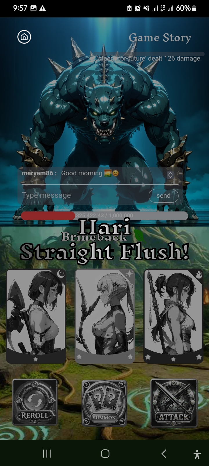 Then I made a second attack. By attacking the second card I gained 320 damage. Along with that I got the hari straight flush award. This wonderful award was able to double my points.