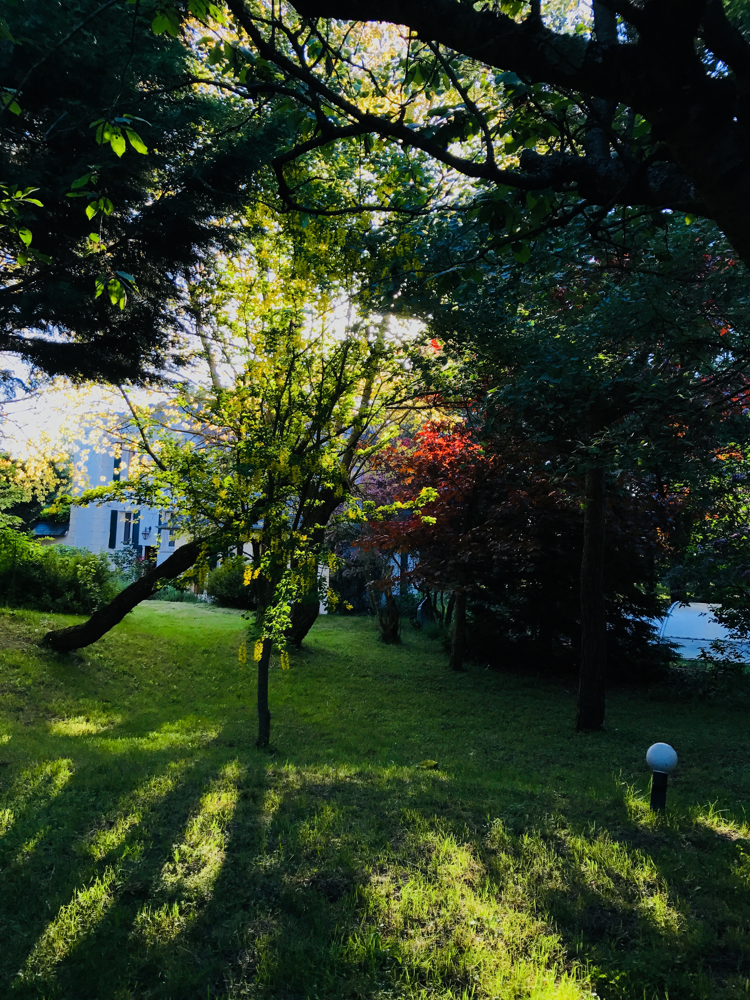 The light of the sunrise through the delicate leaves of a laburnum.