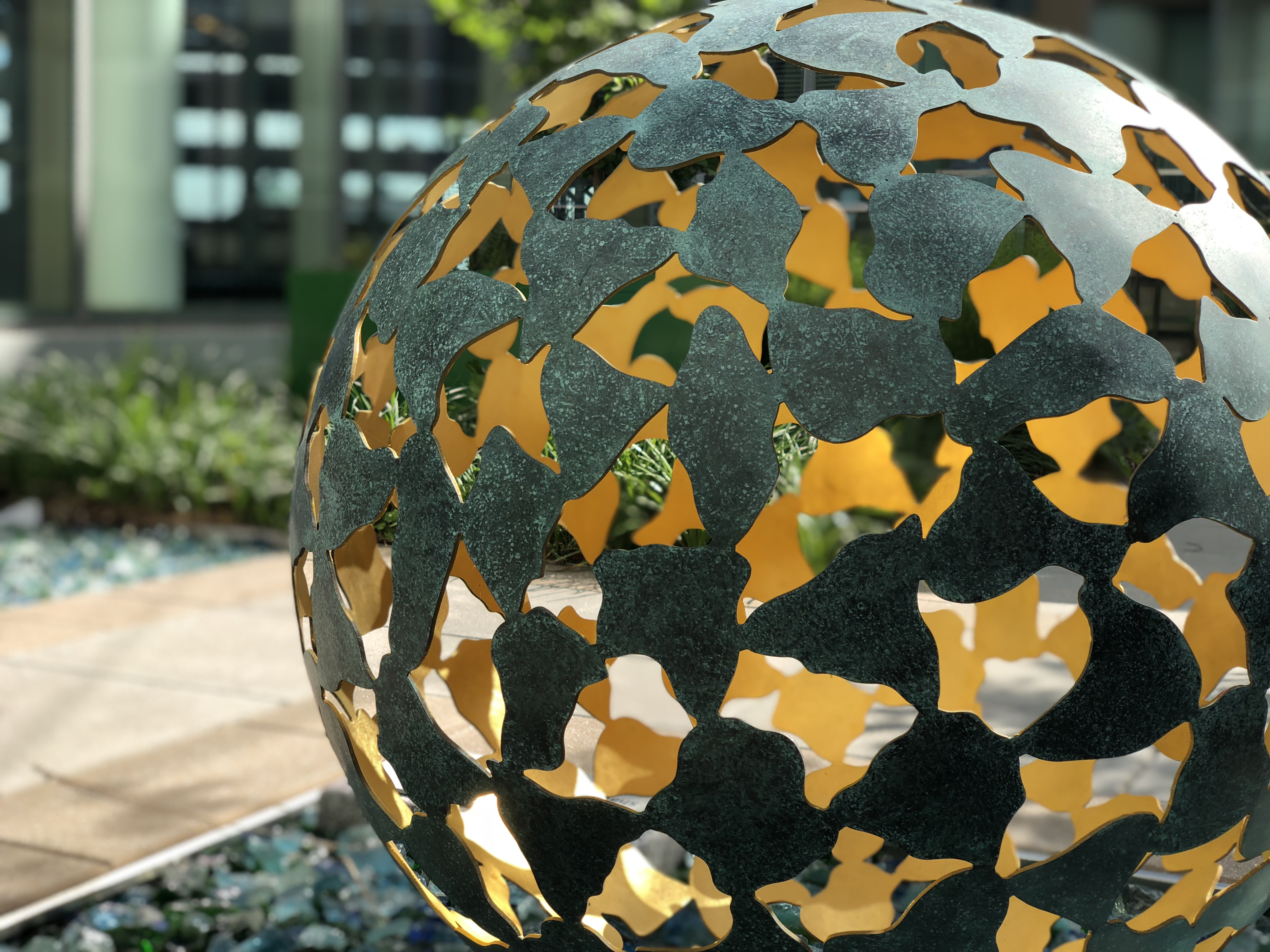 The globe-like sculpture appears to be a representation of the earth, with greyish-blue metal materials intricately connected and linked together to make the whole sphere, creating the image of a delicated cracked shell. The other side of the metal is painted gold, and when lit during the day, resembles the bright, natural yellow color of the sun. It has a natural feeling to the overall structure and shows no sign of rust. The park-like environment, for a moment, creates a sense of tranquility and peacefulness even though we are in the middle of a bustling city.